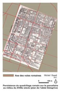 | La ville romaine va se développer au début du Ier siècle après J.-C. rive gauche, sur les pentes de la montagne Sainte-Geneviève, selon un plan quadrillé, dont l’axe, le cardo maximus, est l'ancien chemin gaulois sans doute rectifié (la rue Saint-Jacques). Ce plan parfaitement régulier, typique des villes neuves coloniales, est organisé selon un module carré de 300 pieds romains (88,8 m) qui présente toutefois quelques irrégularités dues aux voies préexistantes et à une transversale partant du forum vers la route de Lyon (rue Lhomond) (1). Au centre de la ville, le forum (rue Soufflot) réunit les fonctions civiles (basilique), religieuses (temple) et commerciales (boutiques). Un théâtre, un amphithéâtre (les arènes de Lutèce) et trois établissements thermaux alimentés par un aqueduc long de 16 km environ amenant l’eau depuis Wissous et Rungis constituent les équipements publics de la ville. la Lutèce gallo-romaine présente ainsi un double aspect, dense et fermé dans l'île, monumental et ouvert sur la rive gauche. < cliquez sur l'image |