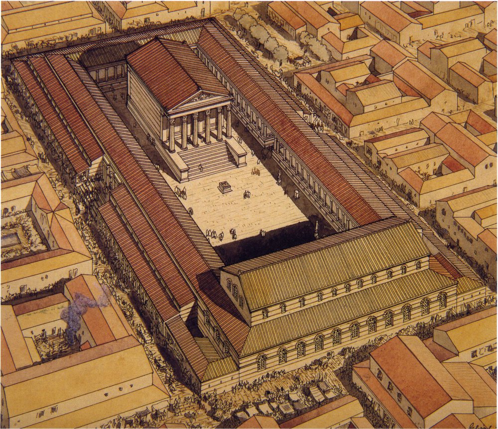 La ville à l’apogée de la paix romaine, soit au début du IIIe siècle après J.C., s’étendait sur 80 à 100 ha : 8 dans l’île de la Cité, 65 à 85 sur la rive gauche et un petit faubourg rive droite. Elle pouvait avoir environ 8 000 habitants (2), nettement moins que les plus grandes villes de Gaule, Trèves, Reims, Lyon, Nîmes, Narbonne, Toulouse, Bordeaux... Le forum, aquarelle de J. C. Golvin > |  |