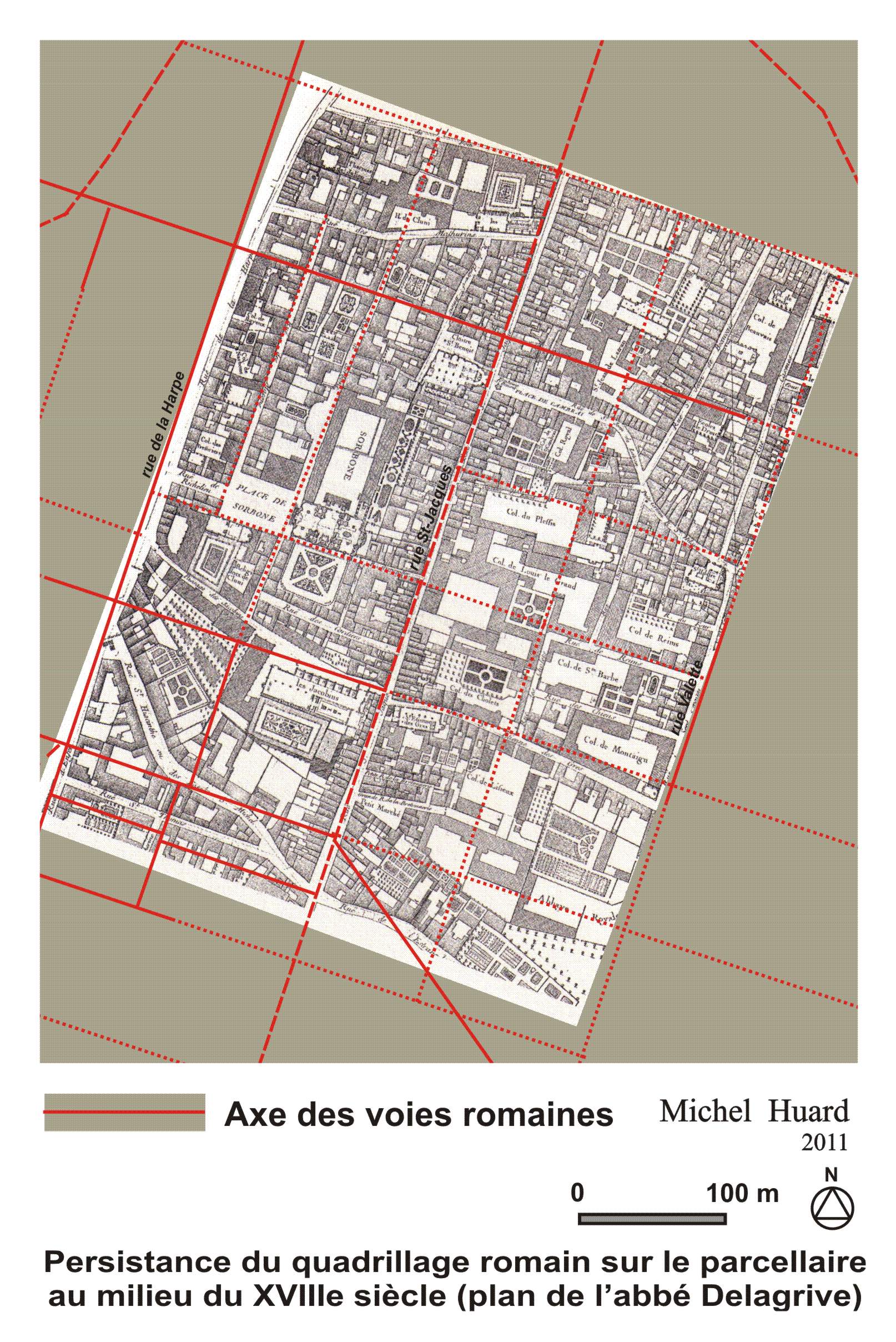 Outre les thermes de Cluny et les arènes, l’héritage romain est encore très perceptible dans le tracé des rues et dans le parcellaire médiéval du quartier latin tel qu’il apparaît sur le plan de l'abbé Delagrive au milieu du XVIIIe s.