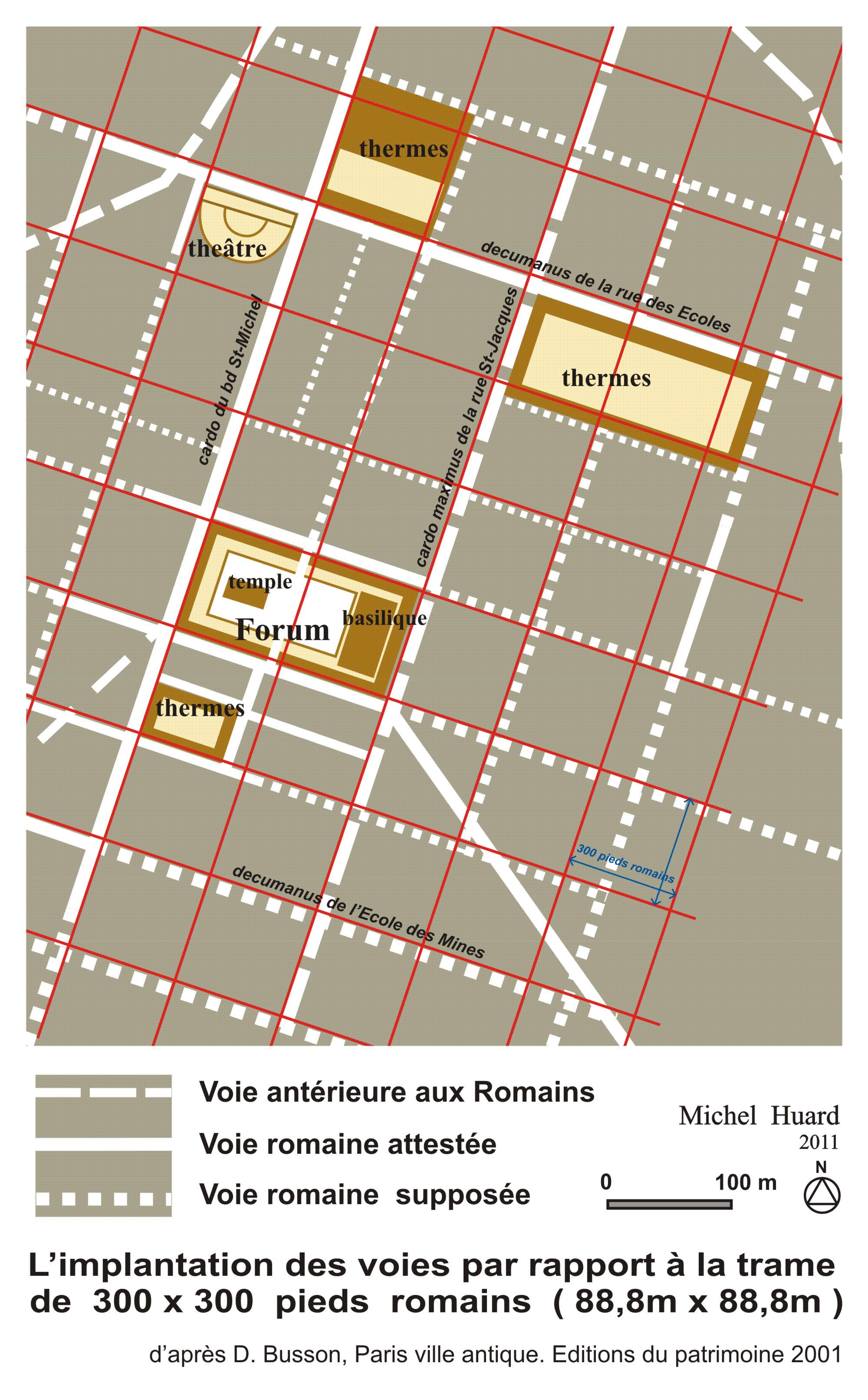 Les travaux du XIXe ont repris les tracés antiques : le boulevard Saint-Michel reprend le tracé d’un cardo, le boulevard Saint-Germain et la rue des Ecoles ceux de deux decumanus ; la rue Soufflot, à l’emplacement du forum, a effacé l’emprise oblique de l’enceinte de Philippe Auguste (3).